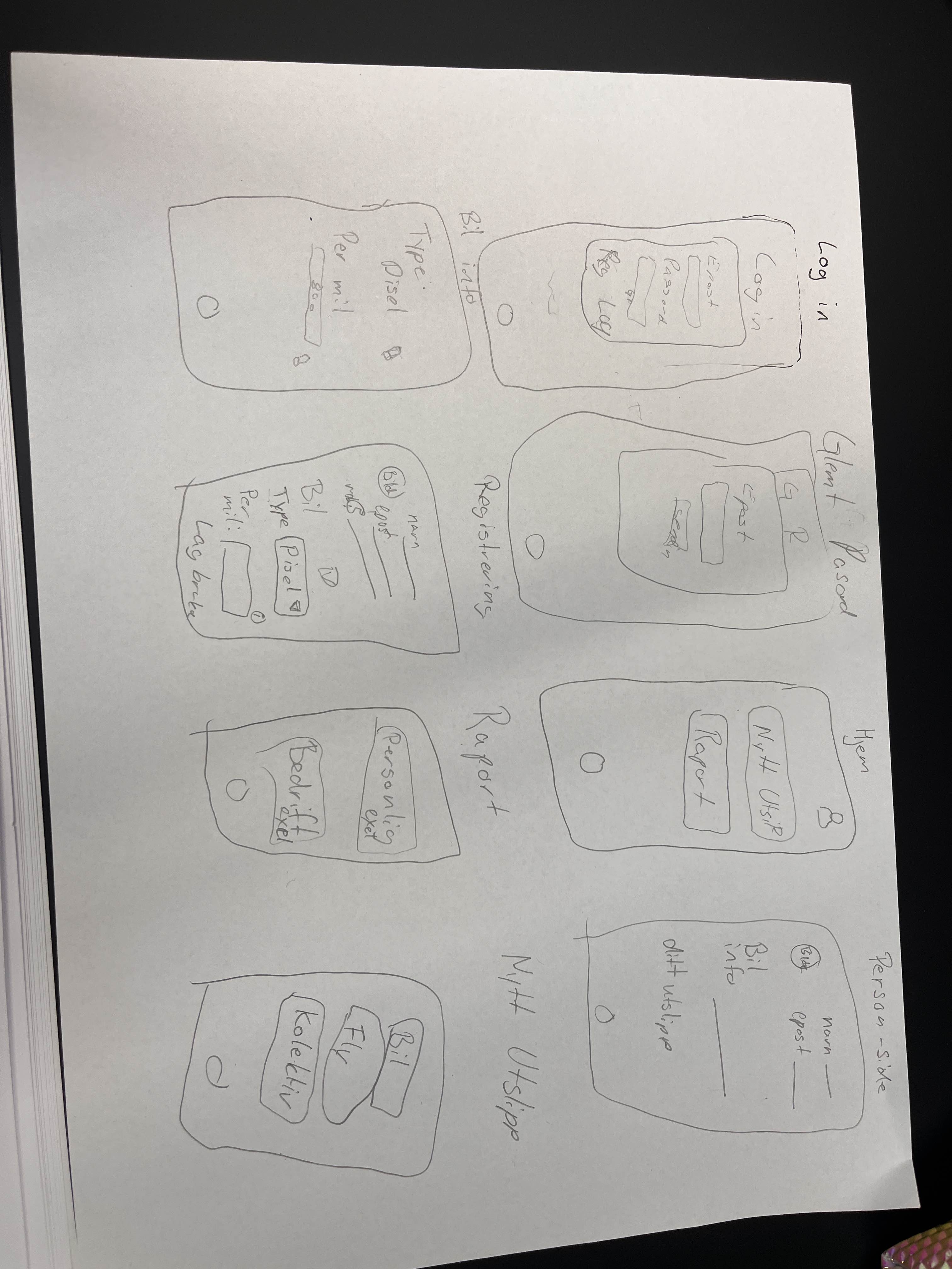 Vi har laget wireframes for applikasjonen og er i gang med å utvikle en prototype. Under ser du noen av skissene vi har laget for å planlegge struktur og funksjoner. Har hatt møte med momentanalyse og fått tilbakemeldinger på prototypen vi har laget i Figma. Der vi kom frem til å bytte ut den enne siden med bil til en annen side som viser forslag 2. Og snakke med miljøfyrtårnet for å se hva deres krav er.